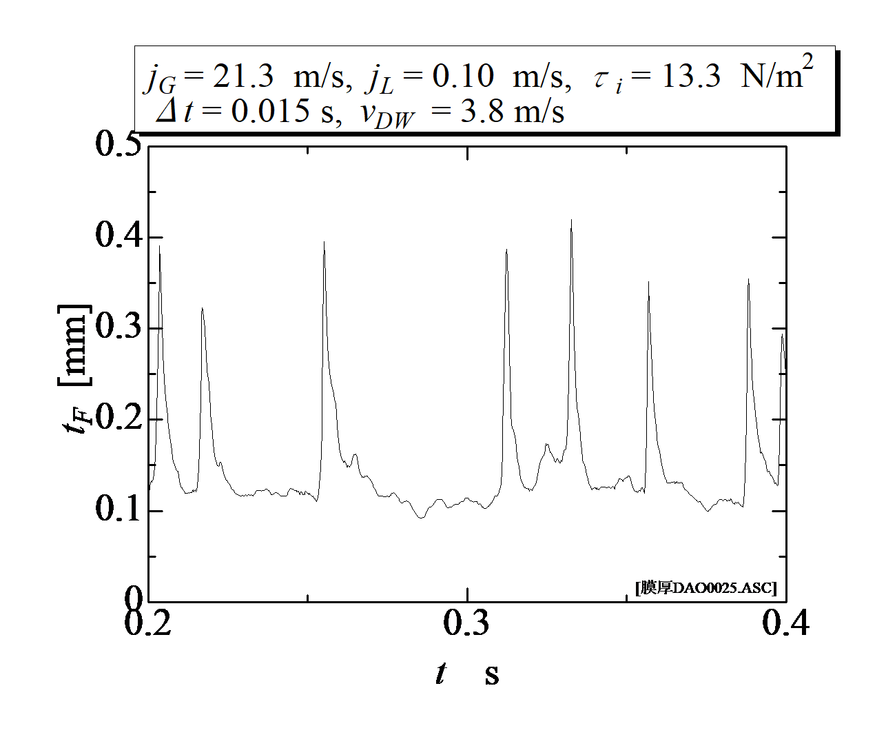 - 気液二相流は、多くの工業プロセスで見られますが、特に原子力発電所や火力発電におけるボイラーでは安全性、経済性の観点から、その把握が特に重要です。一般に、気液二相流特有の複雑な界面現象は、気液物性や流路形状などの影響を強く受けるため、現状では実験相関式に頼るしかなく、圧力の相似則は未だ確立されたとは言いがたい状況です。特に、液膜のドライアウト現象に影響の強い、じょう乱波挙動(図14,15)の把握は、重要とされています。そこで本研究では、気液物性(気液密度、表面張力、粘性係数)が液膜流のじょう乱波挙動に与える基礎的な影響を明確にすることを目的として研究を行っています。特に本研究では、HFC134aガスーエタノール系を用いることで、沸騰水型原子炉の実機状態(圧力7MPa、温度280℃)に似た流れを0.7MPaという比較的低圧下において作り出す方法を提案しています。このような手法により従来は、高温・高圧の実機条件の実験を多数繰り返す必要がありましたが、それを低圧下における実験で代替することで、開発コストの大幅な抑制と開発のスピードアップが可能となると考えています。