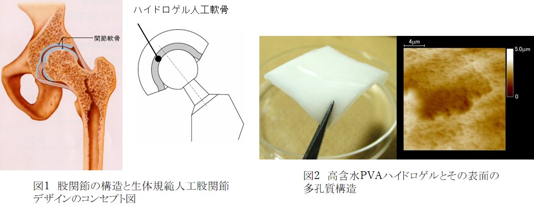 このような課題を克服し,より高機能・長寿命な次世代人工関節を実現するには,これまでとは全く違う設計コンセプトが必要かもしれない.その新しいコンセプトの一つが,生体関節の構造や機能を規範とした,生体模倣人工関節デザインである.生体関節の表面は柔らかく内部に多くの水を含んだ関節軟骨に覆われており,この関節軟骨の物理的,化学的特性が,生体関節に優れた柔軟性と滑らかな可動性を与えている.生体模倣人工関節デザインでは,この関節軟骨に類似の柔軟性と含水性,透水性を持った高分子ハイドロゲルを人工軟骨として関節表面に導入し,人工関節に生体関節と同等の柔軟性と高度な潤滑機能を与え高機能化・長寿命化することを目指している.