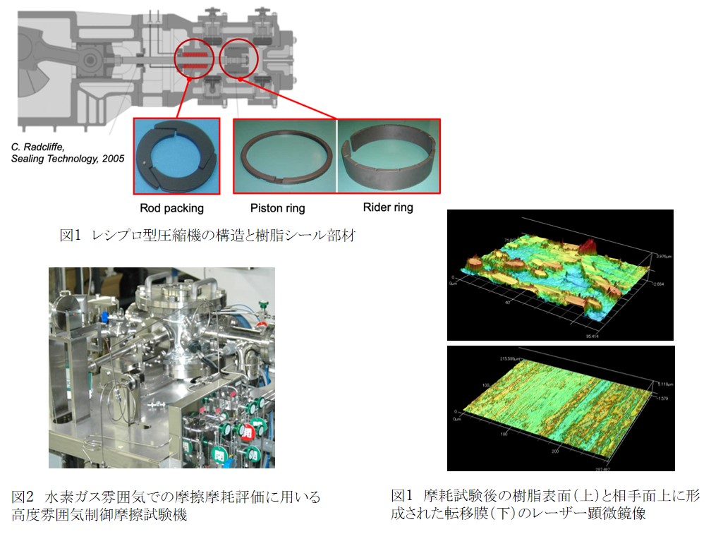 燃料電池自動車に燃料である高圧水素ガスを供給する水素ステーションでは,高圧水素圧縮機を用いて水素ガスを100MPa(1000気圧)程度まで昇圧し,貯蔵,供給している.現在主流となっているレシプロ型水素圧縮機の場合,ガスを密封して圧縮するため,数多くの樹脂製シール部材が使用されている.これらのシール部材は圧縮ガスの高圧と高温に晒されながら高速で摩擦されるため,その材質には機械的強度とともに優れた耐熱性とトライボロジー特性(低摩擦,低摩耗)が求められている.現状では四フッ化エチレン(PTFE)に数種類の充てん材を加えたPTFE複合材が主として用いられているものの,水素ステーションの信頼性向上とメンテナンスコスト軽減のため,更なる耐摩耗性の改善が求められている.
