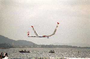 ![]() ![]() 毎年7月に琵琶湖で開催される鳥人間コンテストというものを皆さんはご存知でしょうか? そのコンテストの滑空機部門に第4回大会(1980年)から出場しているのが,我ら九州大学鳥人間チームです. OBには宇宙飛行士の若田光一さんがおり,学生チームの中ではかなり古くから参加しているチームです. 今年は171.89mを飛び,滑空機部門第4位でした. 今回のサイエンスワールドでは,航空本館1番講義室にて, その機体の一部と機体の10分の1の模型を展示する予定です. また,フライトシミュレーションを使って,皆さんにも飛ぶ様子を味わってもらおうと思います. |
