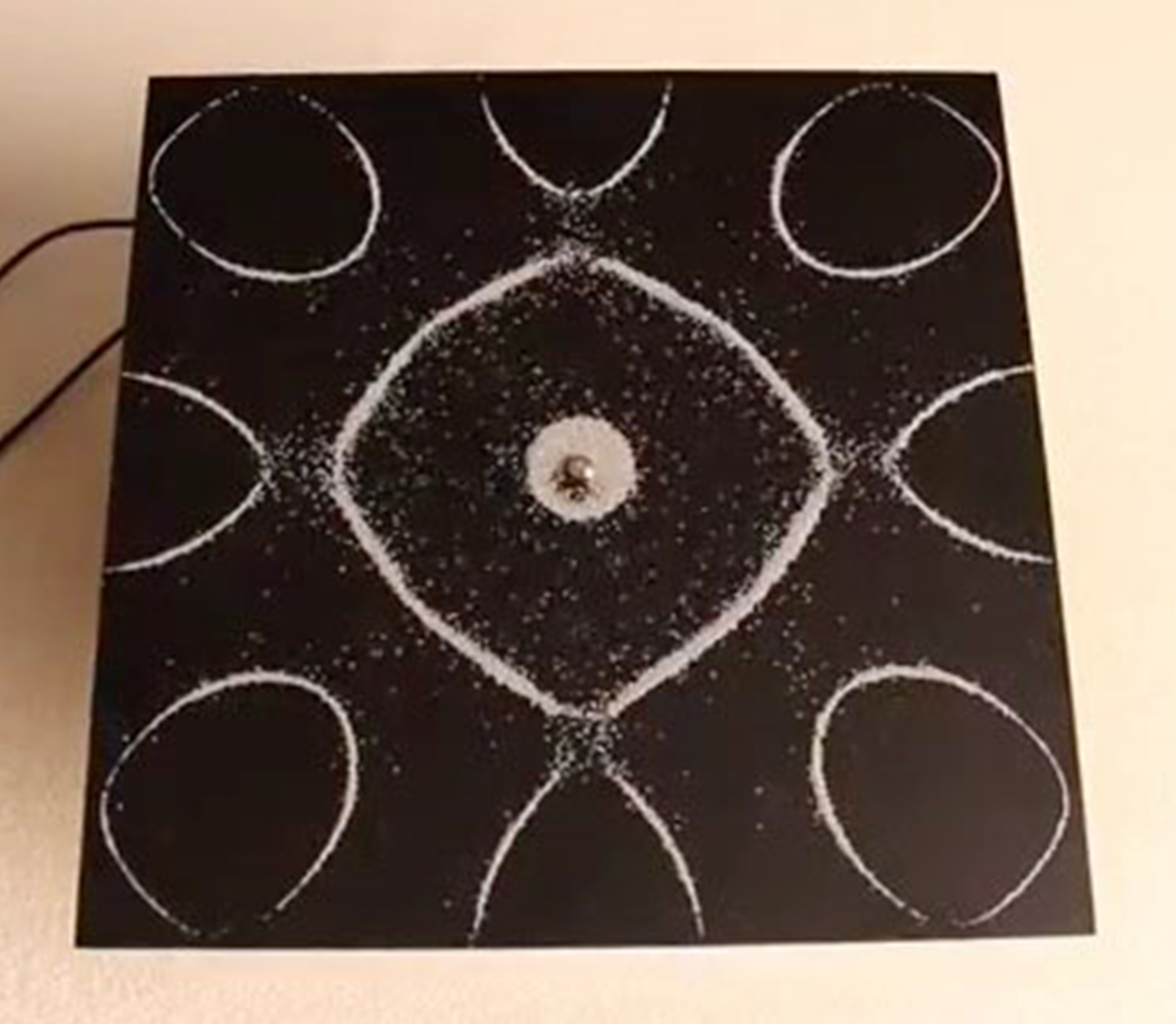 これは、板の中で震えが強い所と弱い所が現れることで発生し、このような模様のことをクラドニ図形と呼びます。